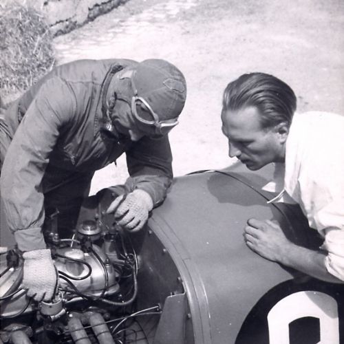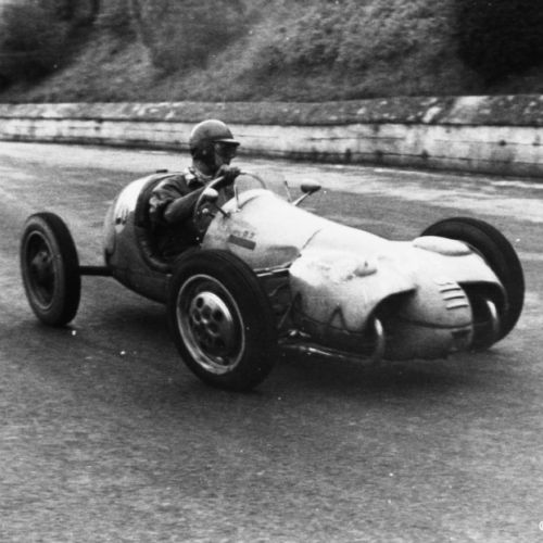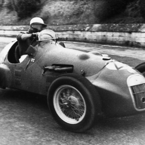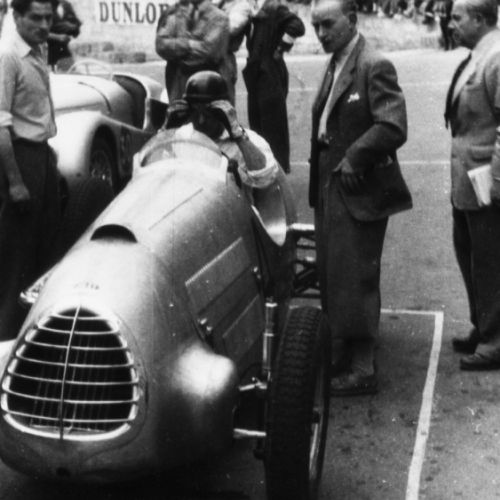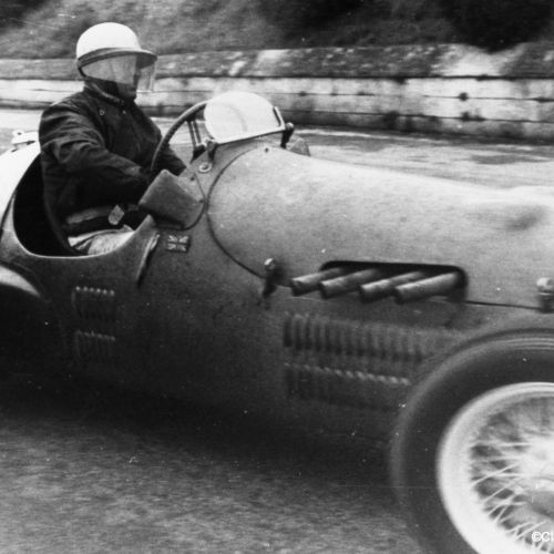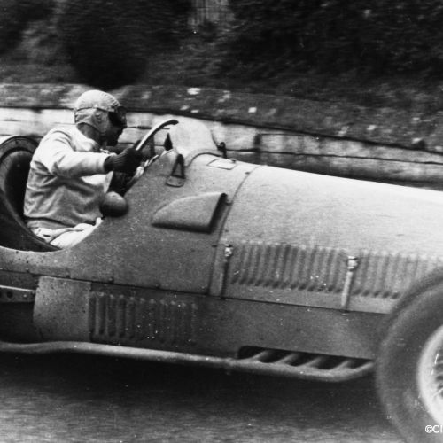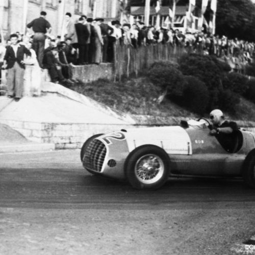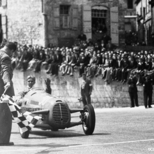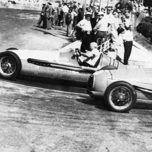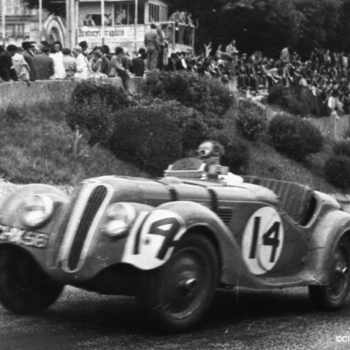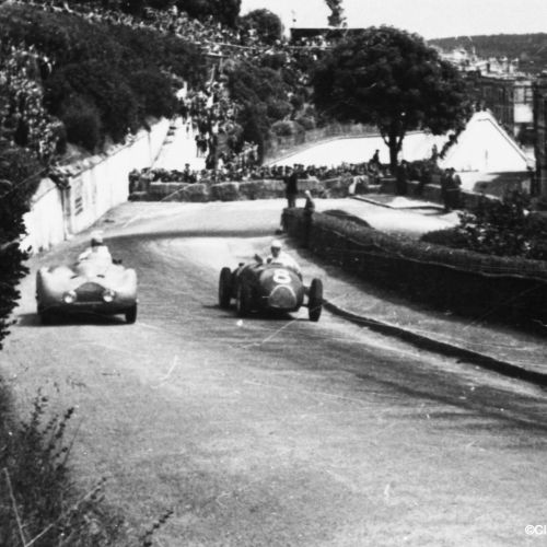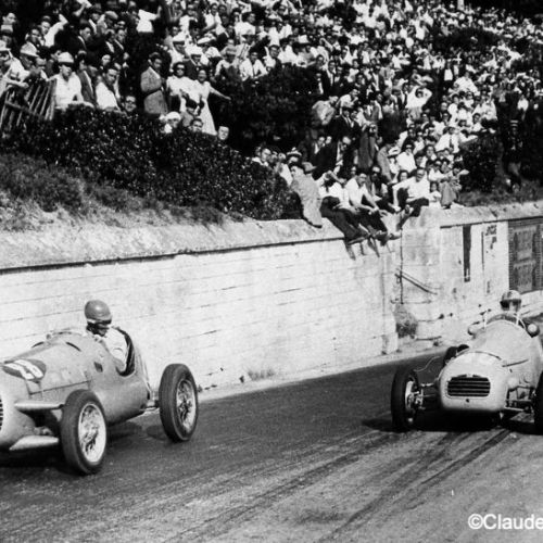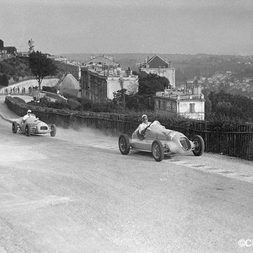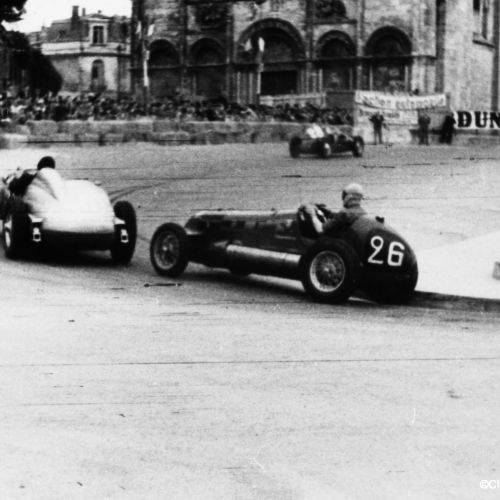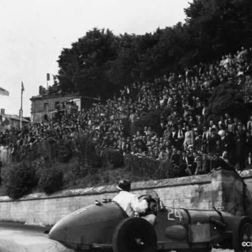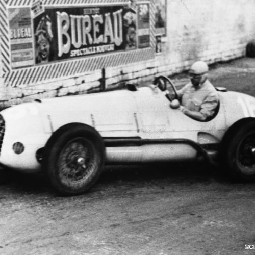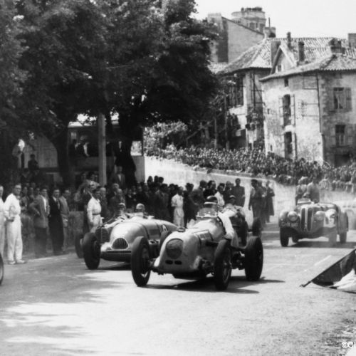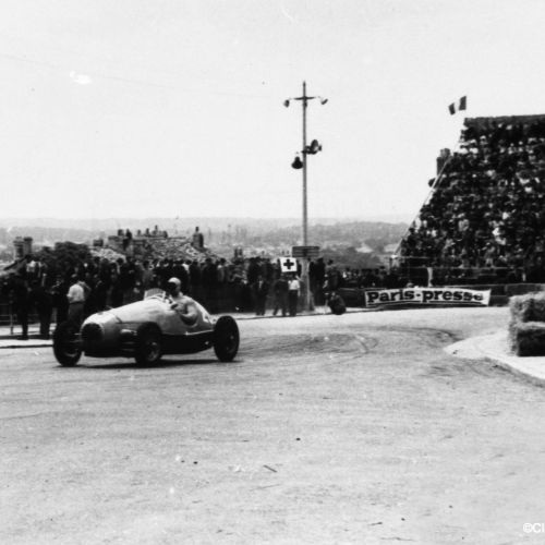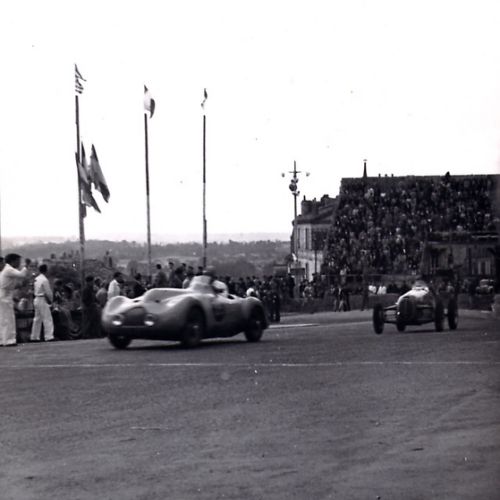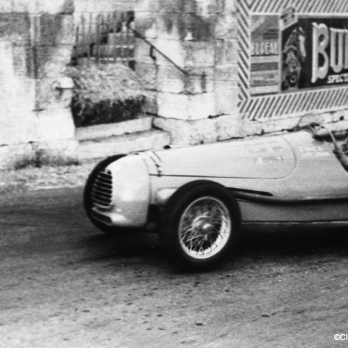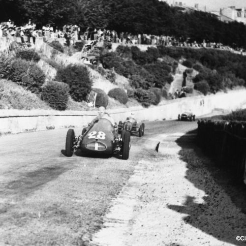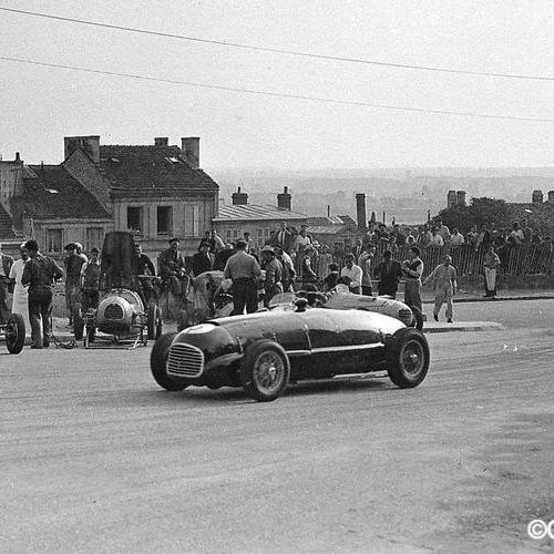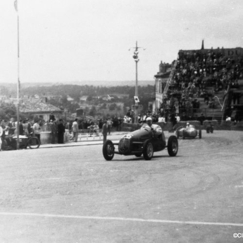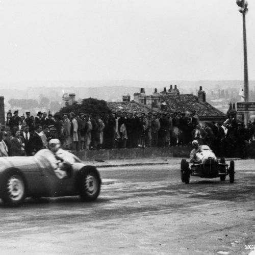 Départ de la deuxième manche éliminatoire. De gauche à droite, Gordini n°20 Jean-Pierre Wimille; au mileu : Peugeot Darl'Mat n°2 Charles de Cortanze ; MG K3 n°24 Ian Connell ; BMW-Frazer Nash n°14 Oscar Moore. Cachées par la Peugeot Darl'Mat et la BMW Frazer Nash, deux Cisitalia, celles de Roger Loyer et l'autre de Raymond de Saugé-Destrez ; dans le fond, drrière la BMW Frazer-Nash, une Monopole Simca n°34 de Pierre Hémard. Résultat de la manche : Roger Loyer, Raymond de Saugé-Destrez, Oscar Moore, Pierre Hémard; abandons: Ian Connell sur fuite du réservoir et Jean-Pierre Wimille casse d'une soupape.