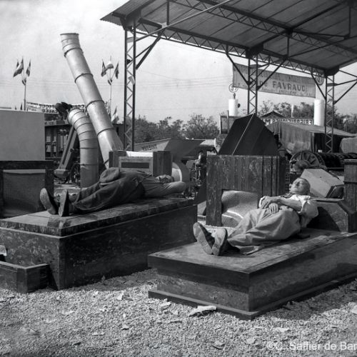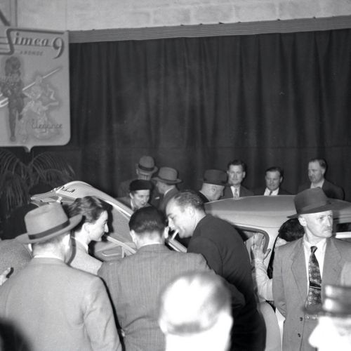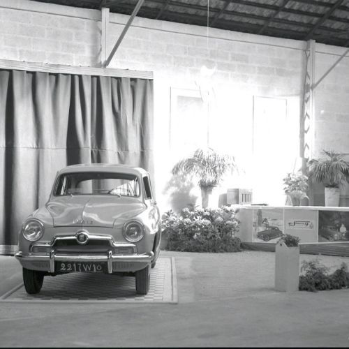 Peugeot 203 publicitaire "Le Rouy d'Or", le stand "Bétine" à la Foire exposition d'Angoulême, présentation de la Simca Aronde au garage Berland, oncessionnaire de la marque rue de Bordeaux à Angoulême.