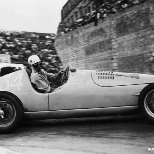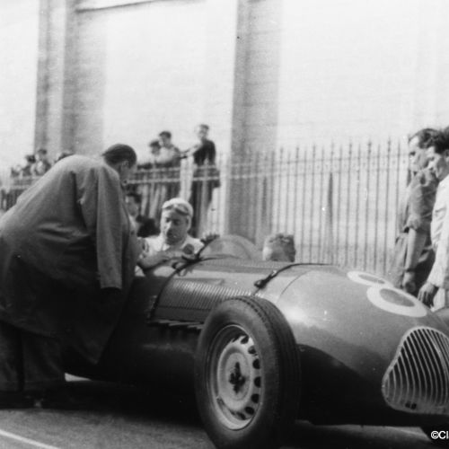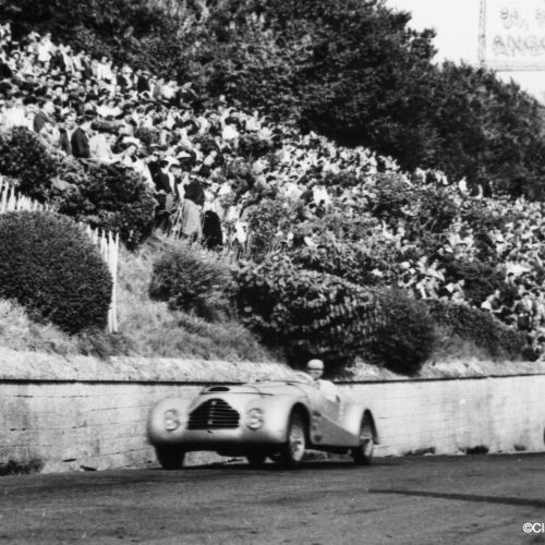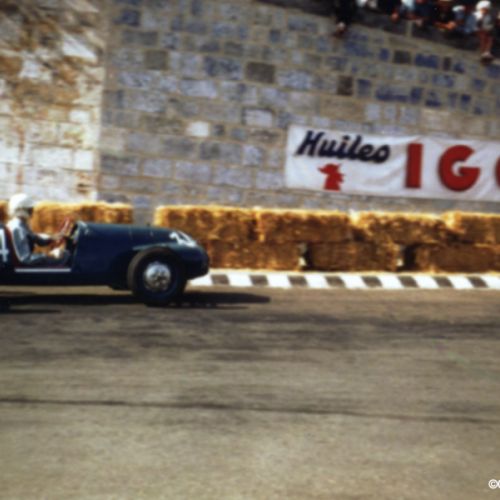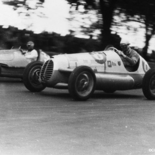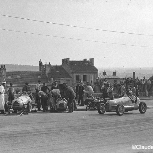 Départ de la deuxième manche éliminatoire. De gauche à droite, Gordini n°20 Jean-Pierre Wimille; au mileu : Peugeot Darl'Mat n°2 Charles de Cortanze ; MG K3 n°24 Ian Connell ; BMW-Frazer Nash n°14 Oscar Moore. Cachées par la Peugeot Darl'Mat et la BMW Frazer Nash, deux Cisitalia, celles de Roger Loyer et l'autre de Raymond de Saugé-Destrez ; dans le fond, drrière la BMW Frazer-Nash, une Monopole Simca n°34 de Pierre Hémard. Résultat de la manche : Roger Loyer, Raymond de Saugé-Destrez, Oscar Moore, Pierre Hémard; abandons: Ian Connell sur fuite du réservoir et Jean-Pierre Wimille casse d'une soupape.