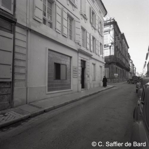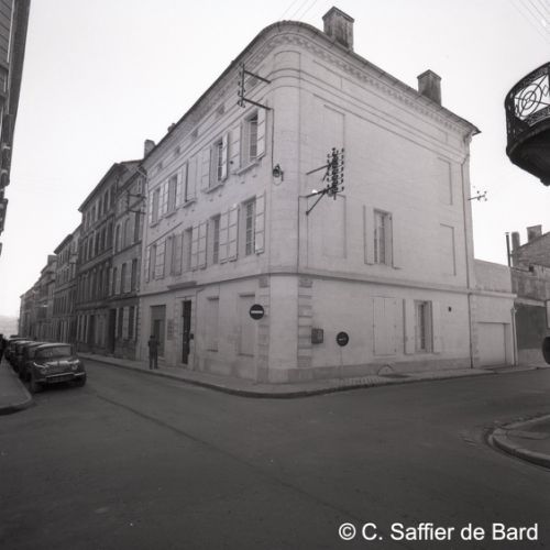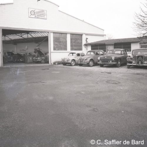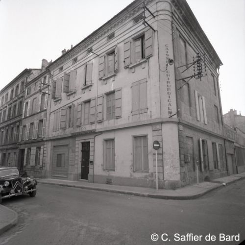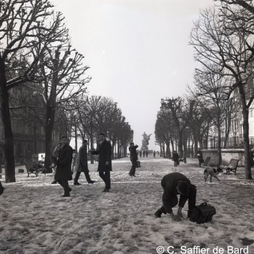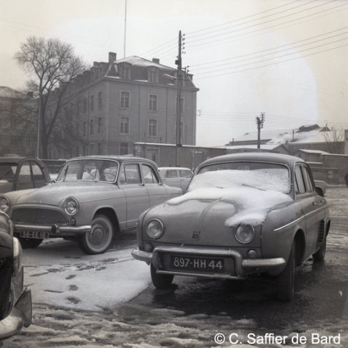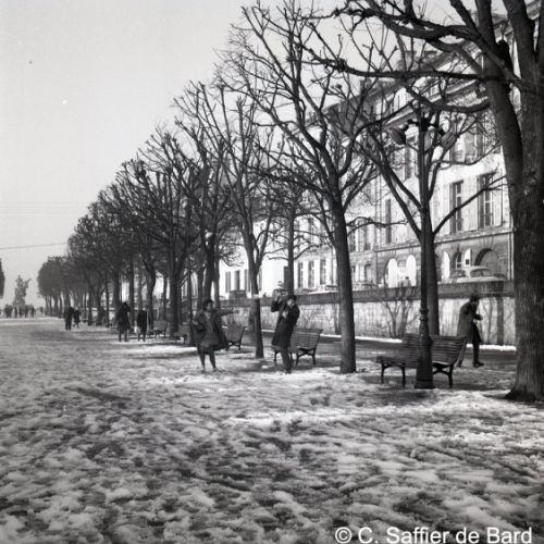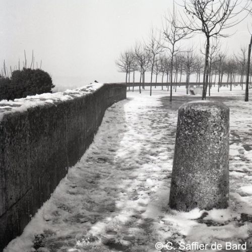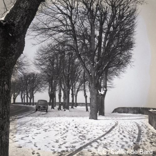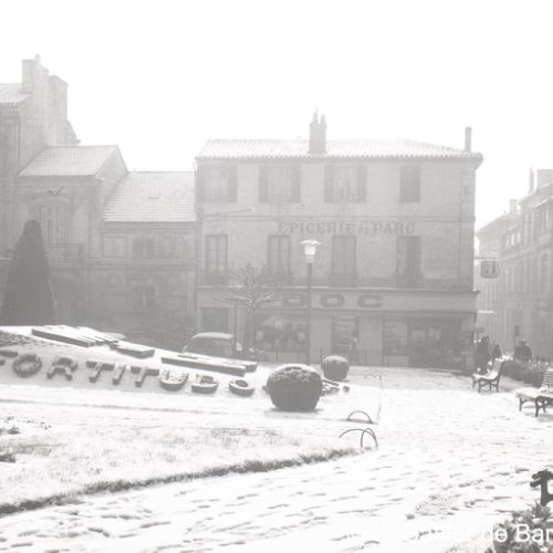 Paysage de neige à Angoulême, le garage Perrier, façade de la Caisse chirurgicale, magasin Brutalis, présentation du papier pelure "Le Nil".
